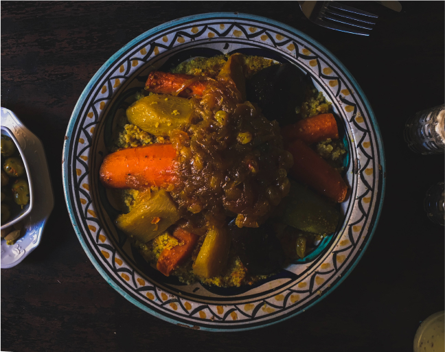 El couscous es otro plato marroquí clásico que se sirve con una variedad de guisos, incluyendo pollo, cordero y verduras. El couscous se prepara a partir de sémola de trigo y se cocina al vapor para crear un plato ligero y esponjoso que complementa perfectamente los sabores más fuertes de los tagines.